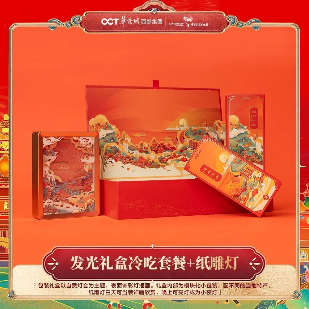 发光礼盒冷吃套餐+特色纸雕灯。礼盒包装以自贡灯会文化为主题,表面饰彩灯插画。插画中融汇自贡风土、物产、特色元素,表面以金线搭配红底,精致大气。礼盒内部为模块化小包装,内含冷吃兔、火边子牛肉、自贡盐井等盐都特色美食。纸雕灯内,自贡风景跃然灯影之间,美轮美奂。画面搭配特产,使礼盒更具有礼赠和纪念价值。
