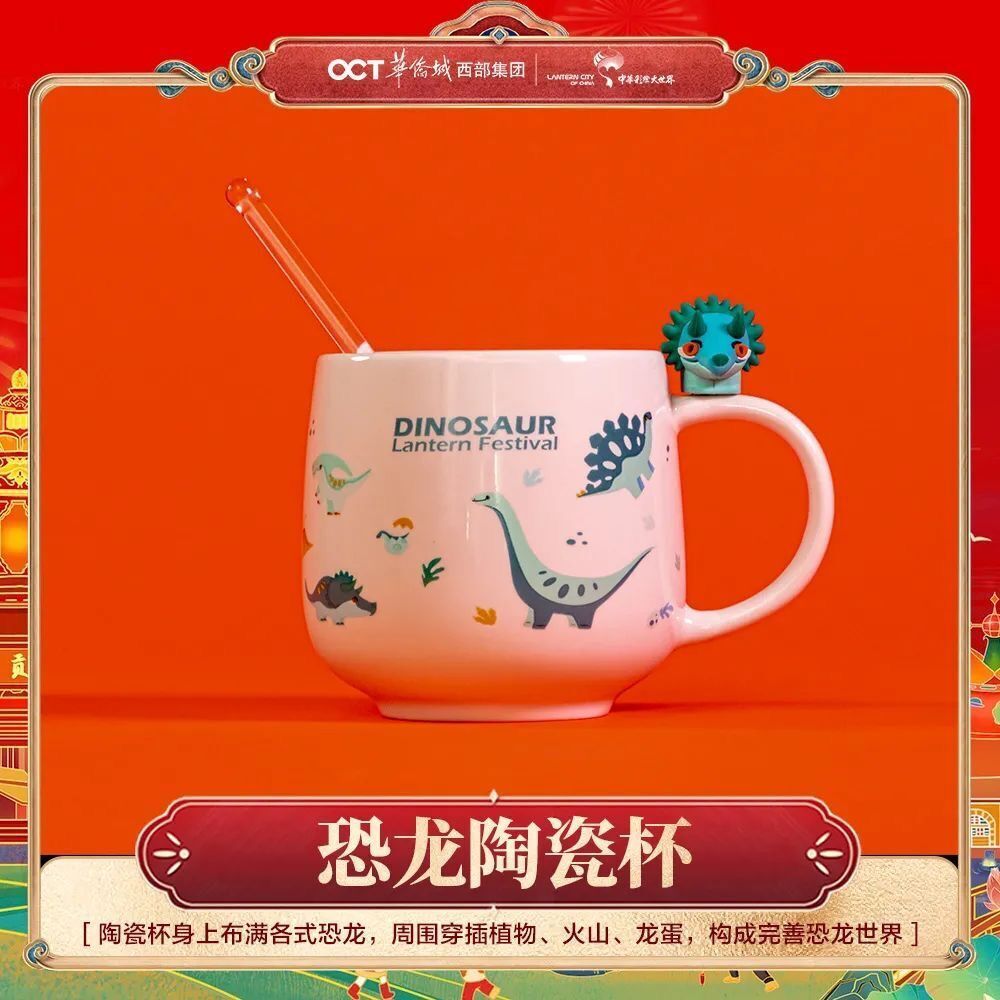 恐龙陶瓷杯+发光搅拌棒。自贡,发掘出了各类恐龙最完整的骨架,是闻名海外的恐龙之乡。恐龙陶瓷杯以恐龙形象为灵感,表面散落恐龙部落,有恐龙、火山、植物和龙胆等卡通形象,与发光搅拌棒上的可爱小恐龙相呼应,趣味盎然。