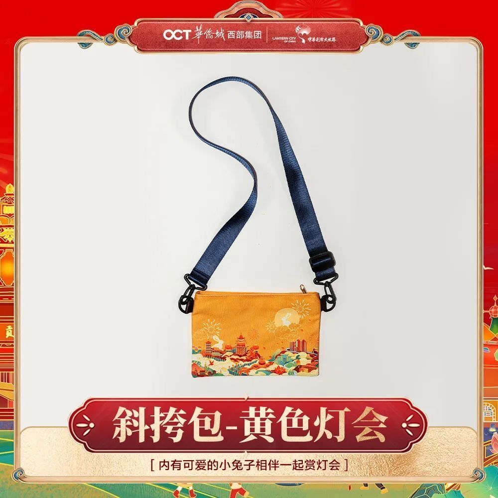 灯会斜挎包。灯会斜挎包表面绘制灯会场景插画。自贡花灯层叠在山云中,天空中绽放绚丽的烟花,内有可爱的小兔子相伴一起赏灯会。整体符合节日氛围,具有纪念意义和实用价值。