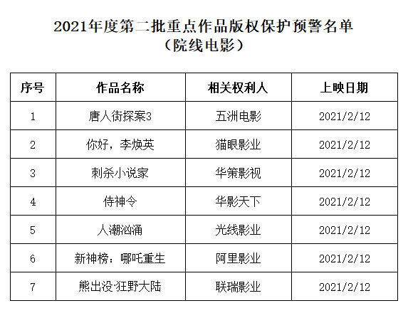 按照国家版权局《关于进一步加强互联网传播作品版权监管工作的意见》及版权重点监管工作计划,根据相关权利人上报的作品授权情况,现公布2021年度第二批重点作品版权保护预警名单。