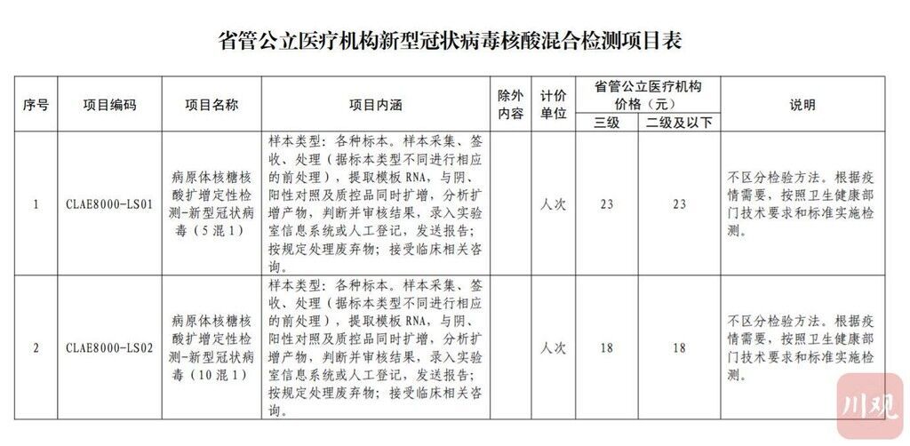 4、省管公立医疗机构“病原体核糖核酸扩增定性检测-新型冠状病毒(5混1)”价格为23元/人次,“病原体核糖核酸扩增定性检测-新型冠状病毒(10混1)”价格为18元/人次(均含检测试剂等耗材),不区分医院等级收费。