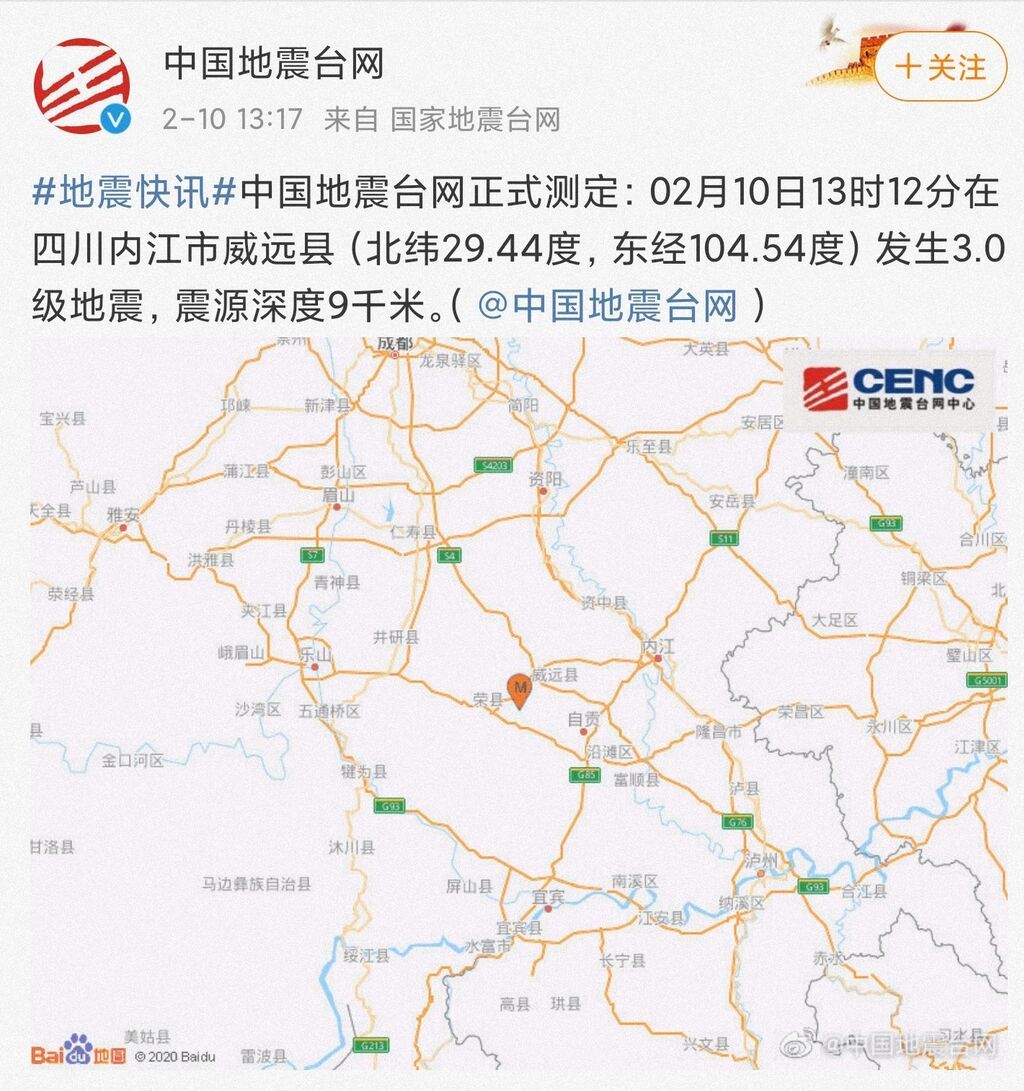 中国地震台网正式测定:2月10日13时12分在四川内江市威远县(北纬29.44度,东经104.54度)发生3.0级地震,震源深度9千米。