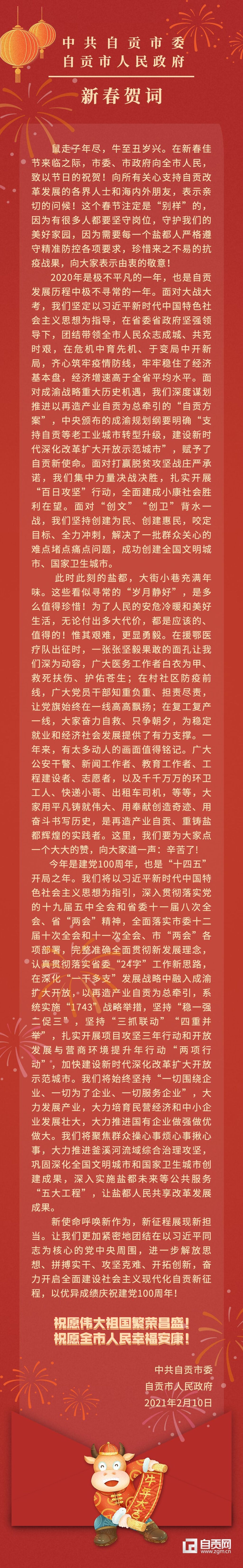 鼠走子年尽,牛至丑岁兴。在新春佳节来临之际,市委、市政府向全市人民,致以节日的祝贺!向所有关心支持自贡改革发展的各界人士和海内外朋友,表示亲切的问候!这个春节注定是“别样”的,因为有很多人都要坚守岗位,守护我们的美好家园,因为需要每一个盐都人严格遵守精准防控各项要求,珍惜来之不易的抗疫战果,向大家表示由衷的敬意!