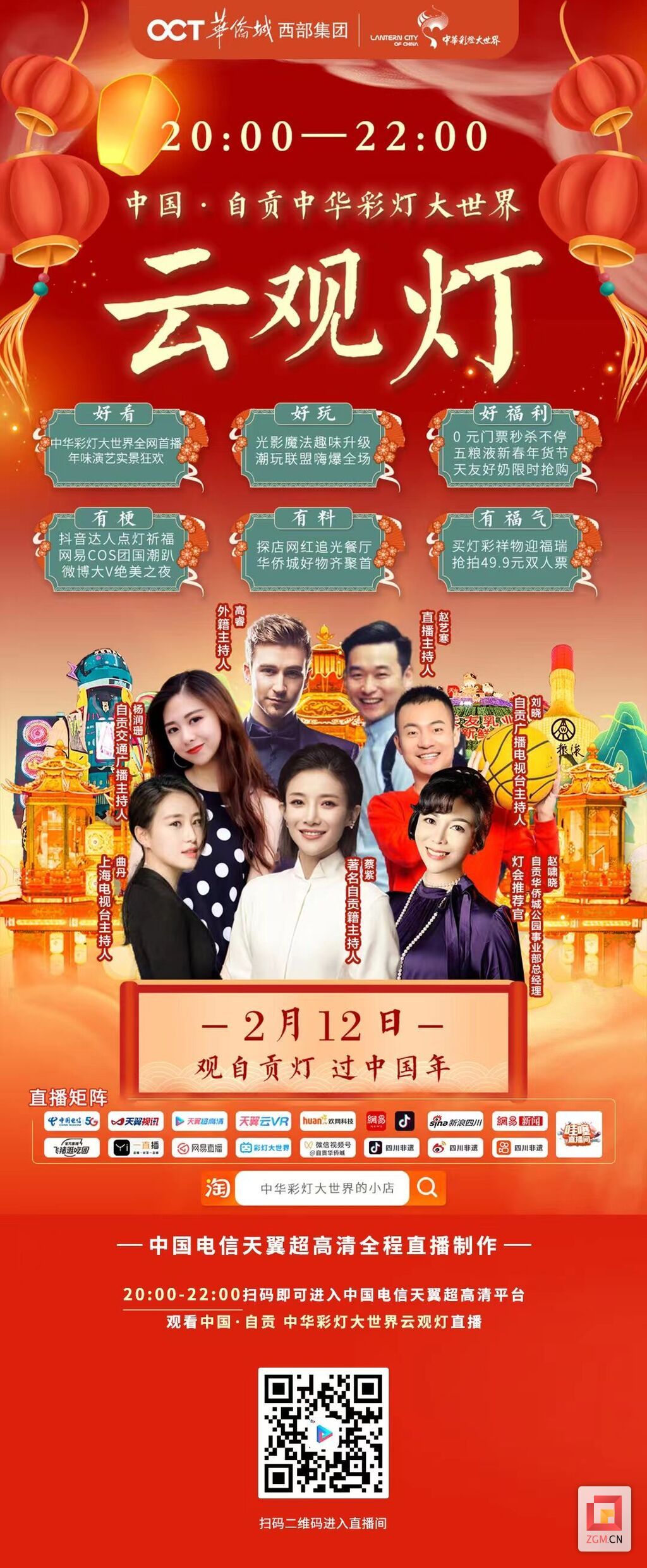 虽然现场没有观众,但希望屏幕前有你。请扫描以下海报二维码进入直播间,一起欣赏自贡中华彩灯大世界内自贡灯会的绝美盛况!