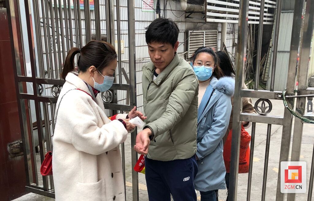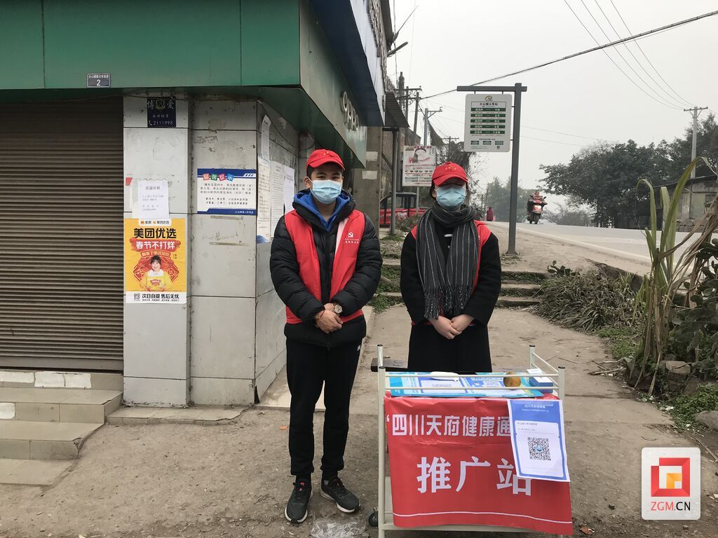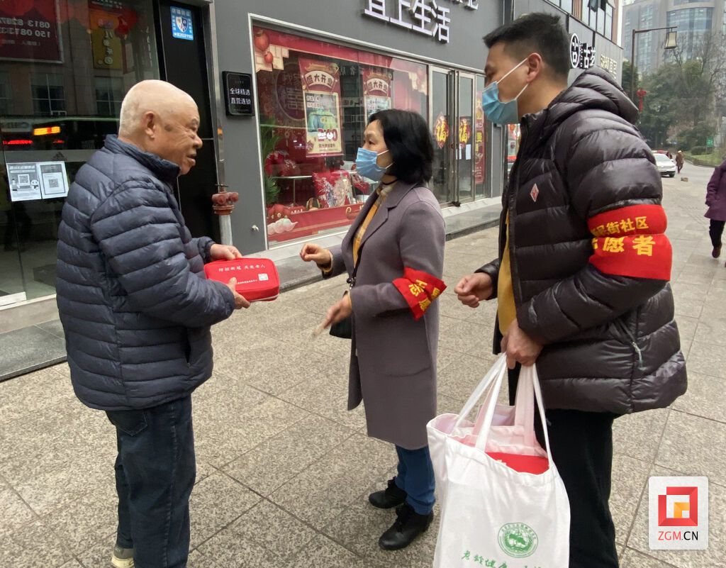▲ 春节期间,市卫健委党员志愿者走进新民街社区,开展疫情防控宣传,发放爱心防疫包,推广使用“天府健康通”健康码。