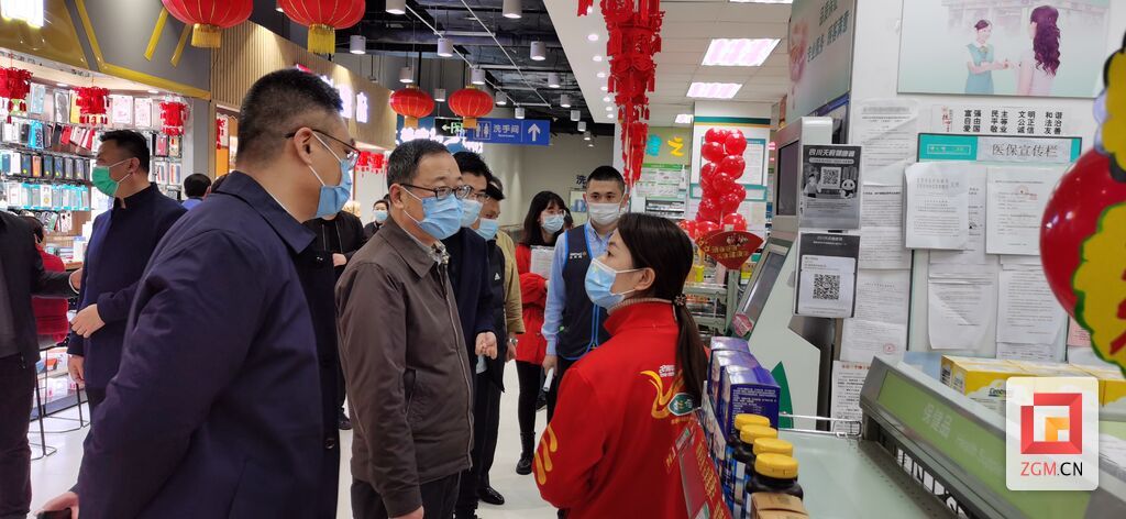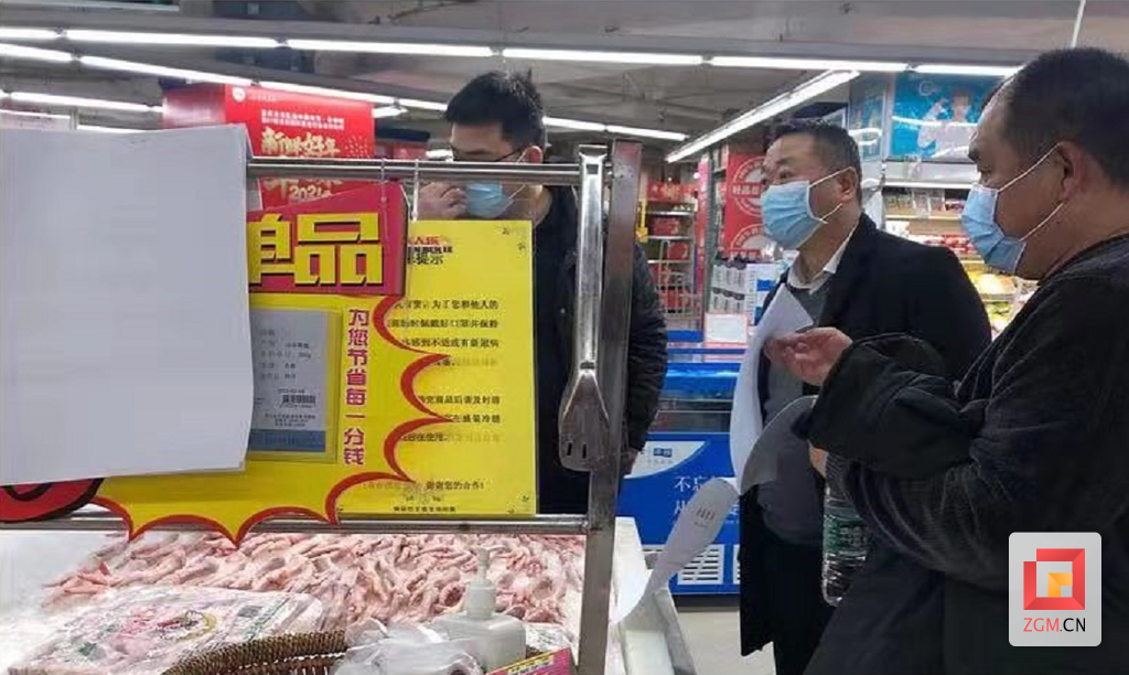 ▲ 2月14日上午,高新区工业办工作人员检查人人乐超市疫情防控情况。