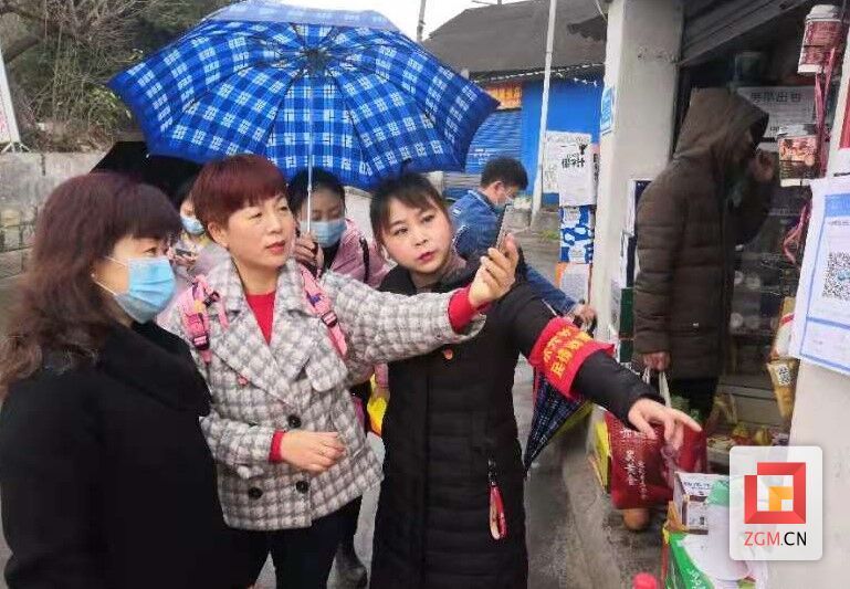 ▲ 2月11日,大安区大山铺镇大山铺社区网格员和志愿者们,向各商户宣传防疫知识,推广四川“天府健康通”健康码、场所码。