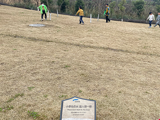 孩子们把草坪当作了足球场,与提示牌形成鲜明对比