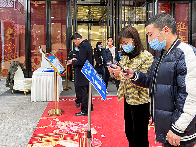 市民在进入商场前扫描天府健康码