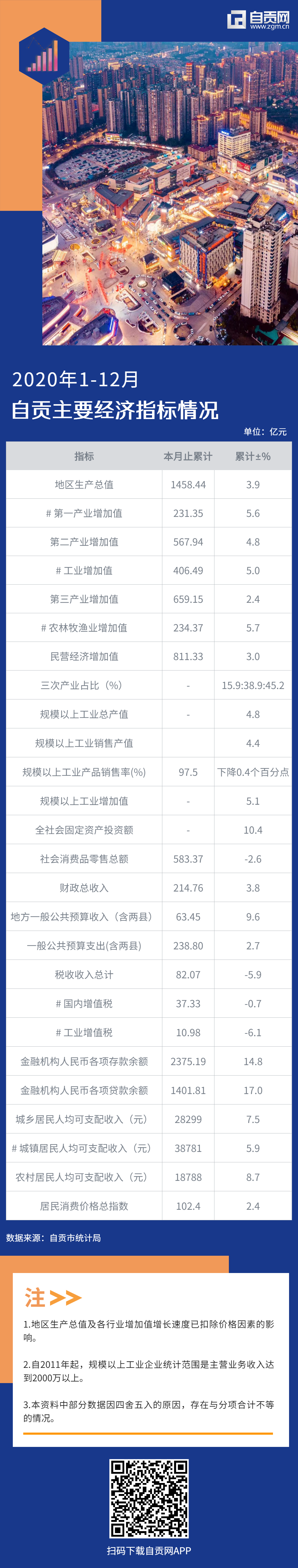 近日,记者从自贡市统计局获悉,2020年1至12月,自贡累计实现地区生产总值1458.44亿元,累计增长3.9%;财政总收入累计完成214.76亿元,累计增长3.8%;居民消费价格总指数累计102.4,累计增长2.4%。