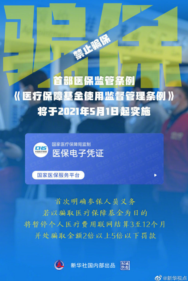 《医疗保障基金使用监督管理条例》2月19日发布,将于2021年5月1日起实施。条例首次明确参保人员义务,若个人以骗保为目的,将医保凭证交由他人冒名使用,或重复享受医保待遇等,将暂停其医疗费用联网结算3至12个月,并处骗取金额2倍以上5倍以下罚款。同时,条例明确要求,医保基金专款专用,任何组织和个人不得侵占或者挪用。(记者 彭韵佳 海报设计 张晨光)