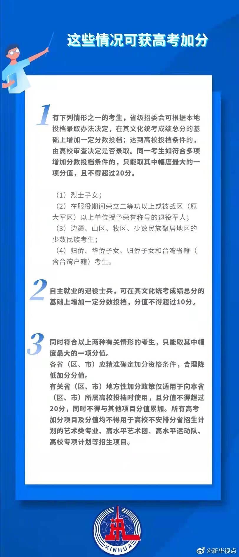 教育部日前发布关于做好2021年普通高校招生工作的通知明确,有这些情形的考生,可在文化统考成绩总分的基础上增加一定分数投档。详情请看大图。