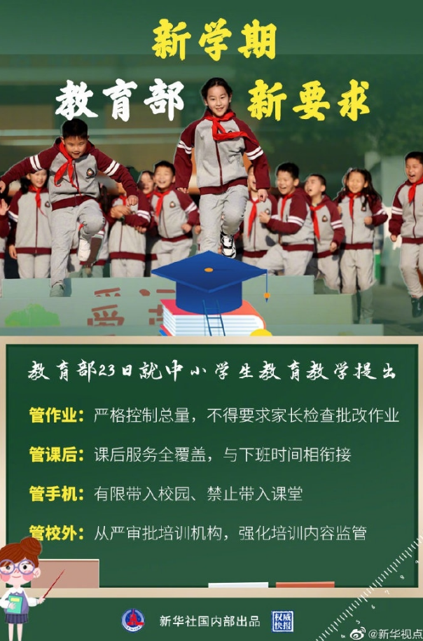 23日,教育部召开发布会,介绍春季学期中小学教育教学有关工作情况。教育部基础教育司表示,要着力强化学生作业管理。鼓励布置分层次作业、弹性作业、个性化作业,注重设计探究性作业、实践性作业,探索跨学科作业、综合性作业,坚决克服机械、无效作业,杜绝重复性、惩罚性作业。任课教师要认真批改作业,及时做好反馈,注重加强面批讲解,认真分析学情,对存在的问题做好学生答疑辅导。不得给家长布置或变相布置作业,不得要求家长检查、批改作业。