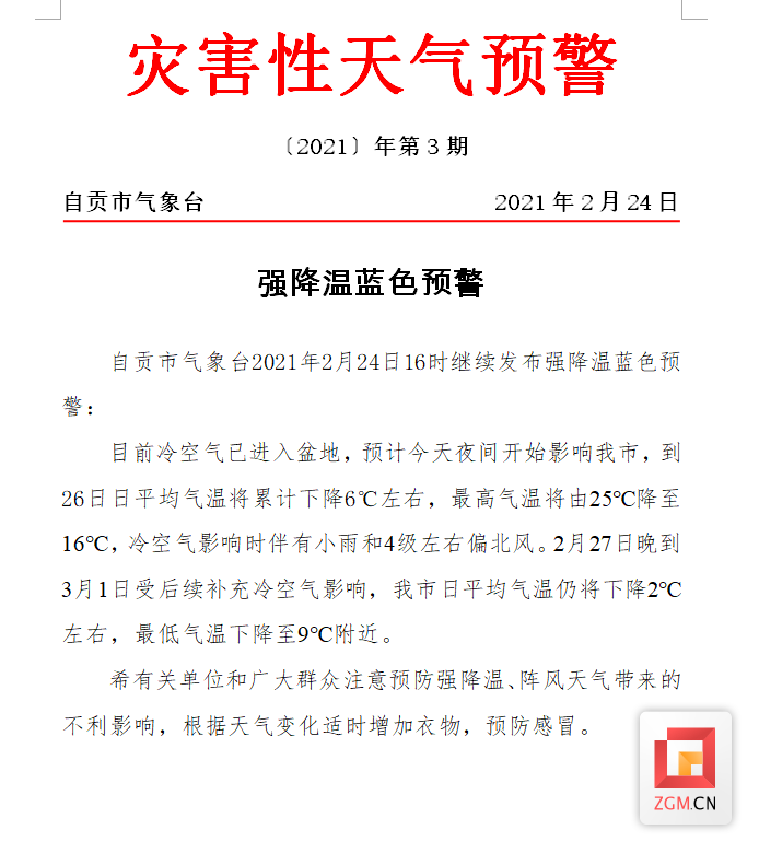 2月24日16时,自贡市气象台发布强降温蓝色预警:目前冷空气已进入盆地,预计今天夜间开始影响我市,到26日日平均气温将累计下降6°C左右,最高气温将由25°C降至16°C,冷空气影响时伴有小雨和4级左右偏北风。2月27日晚到3月1日受后续补充冷空气影响,我市日平均气温仍将下降2°C左右,最低气温下降至9C附近。