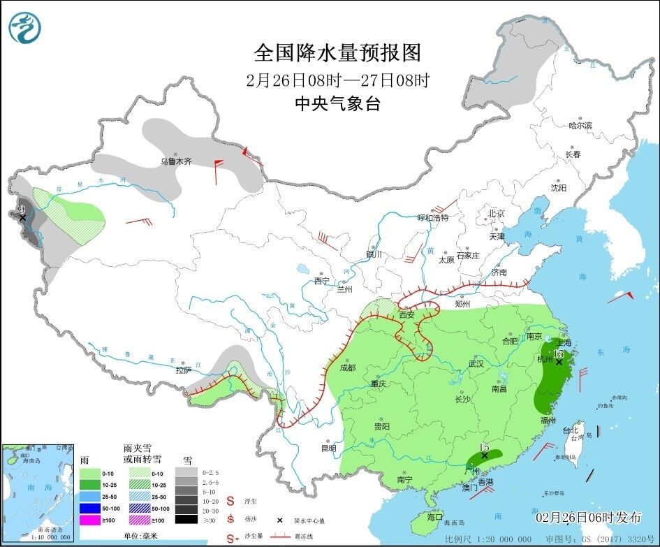 2月26日08时至27日08时,新疆西南部及沿天山地区、内蒙古东北部等地的部分地区有小到中雪或雨夹雪,局地大雪。黄淮南部、江淮、江汉、江南、华南、西南地区东部等地的部分地区有小到中雨。新疆东部、内蒙古中西部、甘肃河西走廊等地的部分地区有5~7级风,新疆山口地区风力9~11级(见图2)。