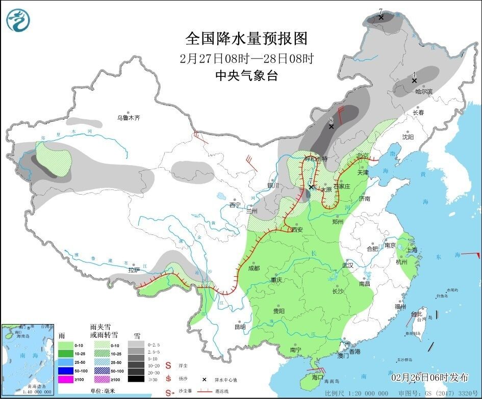 27日至3月1日,中东部地区将出现一次大范围雨雪过程,西北地区东部、华北西部和北部、东北地区将出现降雪或雨夹雪,其中,甘肃东部、陕西北部、内蒙古中东部、华北西部和北部以及东北地区等地的部分地区有中到大雪,局地有暴雪。华北平原至陕西关中及其以南大部地区有小到中雨,局地有大雨。