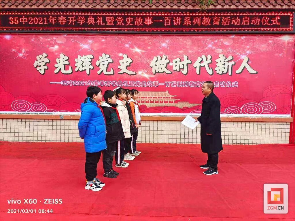 今年,恰逢中国共产党成立100周年,开学典礼也有了“红色”味道。自贡市第三十五中在开学典礼上启动党史故事百讲系列教育活动,学校校长梁杰为大家讲述中国共产党100年来走过的艰辛历程和动人故事,号召同学们感党恩、听党话、跟党走,争做栋梁之才,在新学期努力进取。