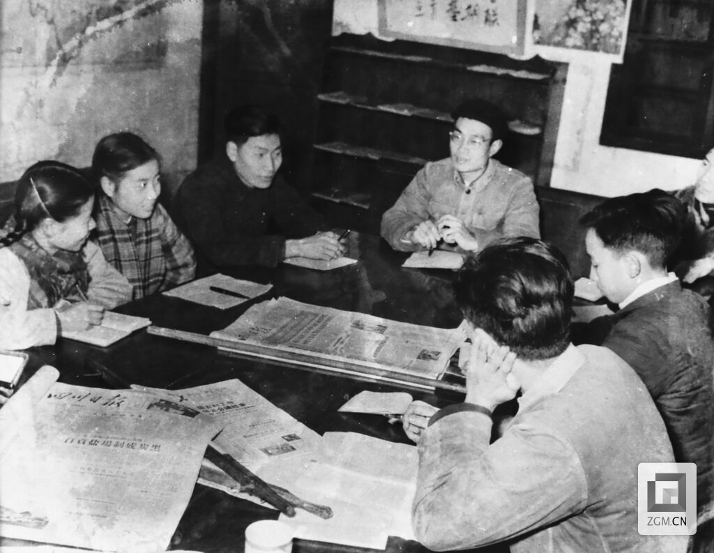 图:1958年,自贡日报社总编辑费少康(中)组织采编人员召开业务研讨会