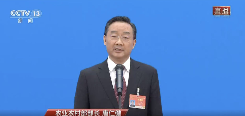 在回应记者关于粮食安全的相关问题时,唐仁健表示,在我们这个有14亿人口的大国,吃饭问题始终是治国理政的头等大事,也是农业农村工作面临的一个永恒主题。