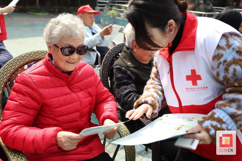 和煦的阳光下,志愿者与老人们围坐一圈,向他们发放和讲解红十字“三献”和应急救护知识宣传单,详细询问他们在这里的生活情况和身体状况。