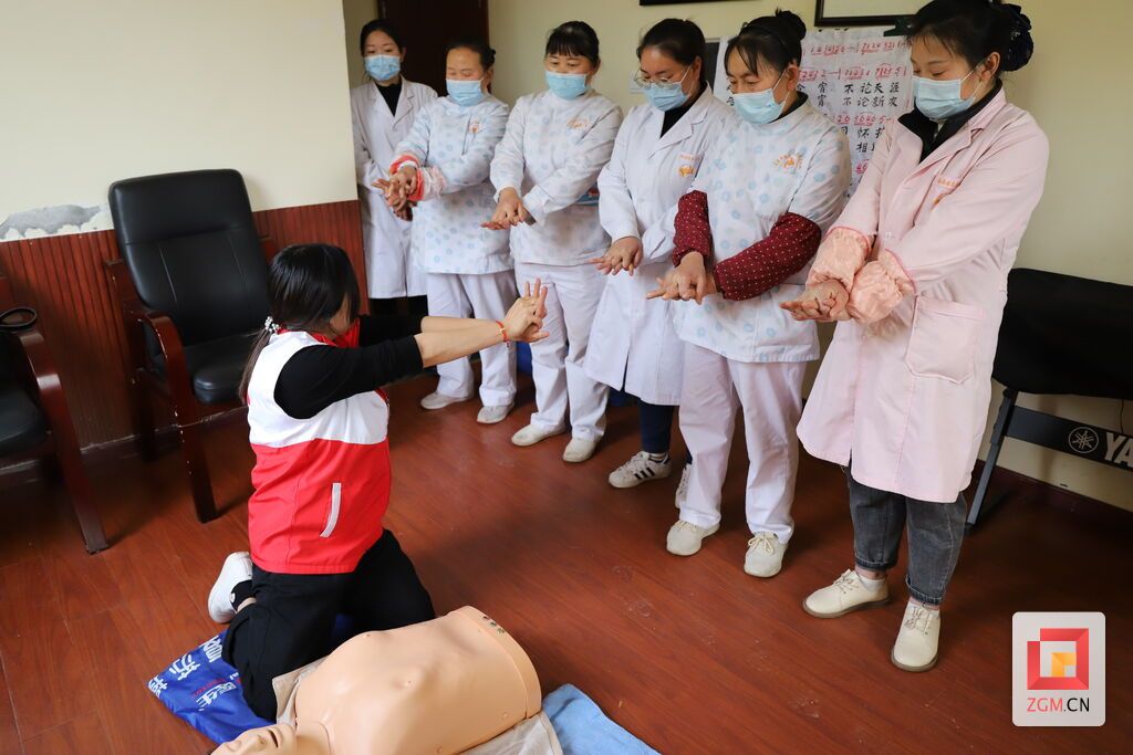 红十字救护师资还深入浅出地传授了养肝、饮食、睡眠、起居等春季养生“法宝”,并指导养老院护工实操练习心肺复苏术。