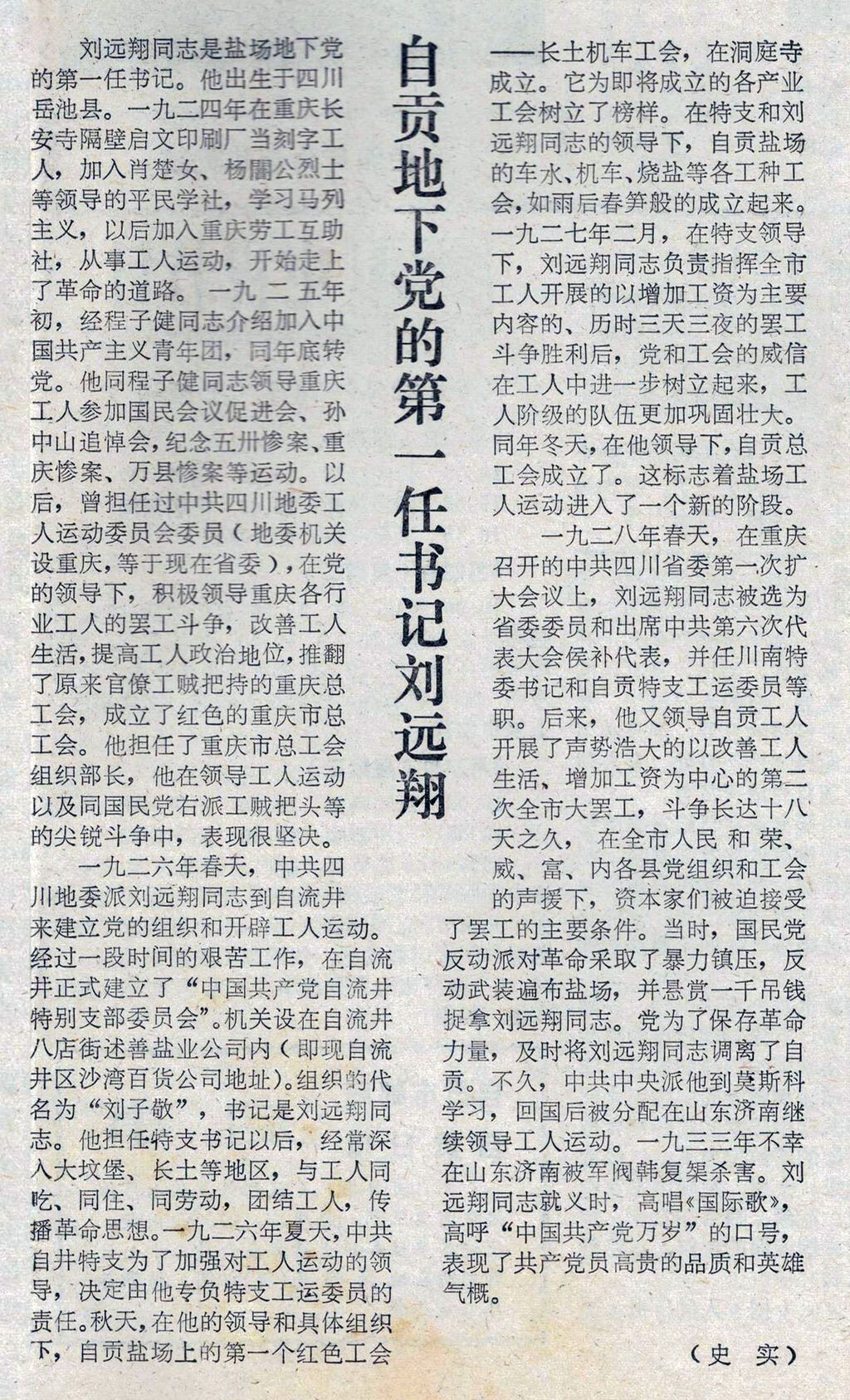 一九二六年春天,中共四川地委派刘远翔同志到自流井来建立党的组织和开辟工人运动。经过一段时间的艰苦工作,在自流井正式建立了“中国共产党自流井特别支部委员会”。机关设在自流井八店街述善盐业公司内(即现自流井区沙湾百货公司地址)。组织的代名为“刘子敬”,书记是刘远翔同志。他担任特支书记以后,经常深入大坟堡、长土等地区,与工人同吃、同住、同劳动,团结工人,传播革命思想。一九二六年夏天,中共自井特支为了加强对工人运动的领导,决定由他专负特支工运委员的责任。秋天,在他的领导和具体组织下,自贡盐场上的第一个红色工会——长土机车工会,在洞庭寺成立。它为即将成立的各产业工会树立了榜样。在特支和刘远翔同志的领导下,自贡盐场的车水、机车、烧盐等各工种工会,如雨后春笋般地成立起来。一九二七年二月,在特支领导下,刘远翔同志负责指挥全市工人开展的以增加工资为主要内容的、历时三天三夜的罢工斗争胜利后,党和工会的威信在工人中进一步树立起来,工人阶级的队伍更加巩固壮大。同年冬天,在他领导下,自贡总工会成立了。这标志着盐场工人运动进入了一个新的阶段。