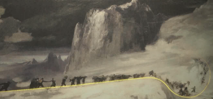 这件作品应该说是革命历史题材创作中的一幅经典,作品左侧的云端好像是凝固在天空中,和右边的暴风雪在构图上正好起到一个回应的作用。