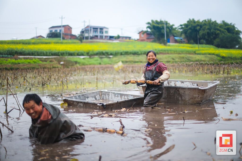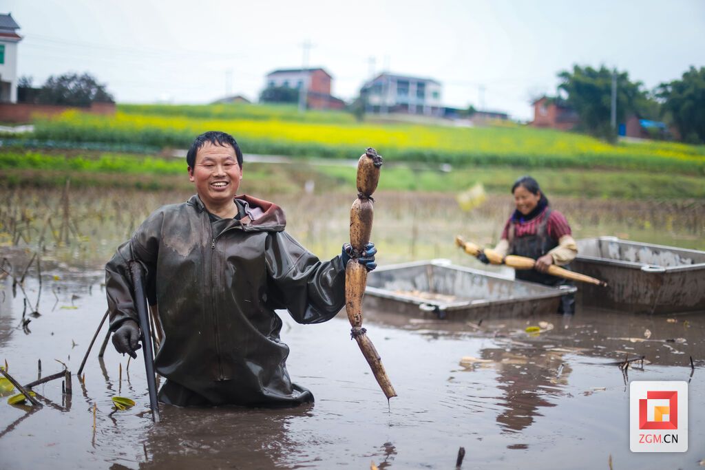 初春时节,草长莺飞,经过一个冬天的生长,贡井区龙潭镇稻澄村村民李树海去年种下的最后一批莲藕成熟了。3月12日吃过午饭后,他和妻子一起来到藕塘里挖莲藕。