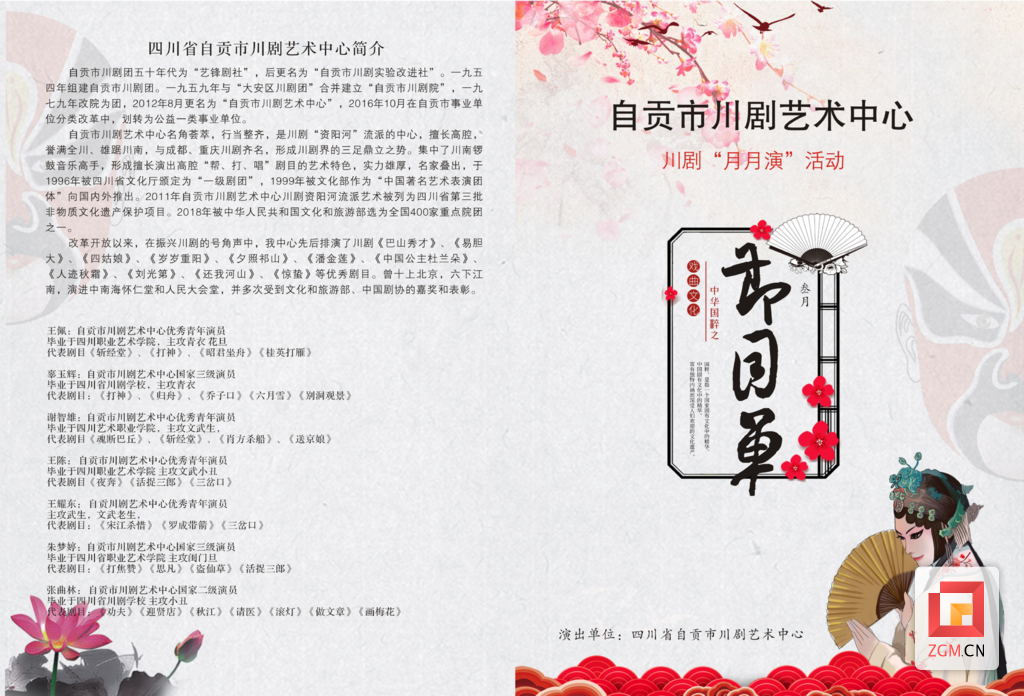 为坚持社会效益优先,传承发展好“资阳河流派川剧艺术”,市川剧艺术中心将从今年3月起,在每月18日下午14:30至16:30,定时定点开展自贡川剧“月月演”活动,演出节目以传统川剧折子戏为主。