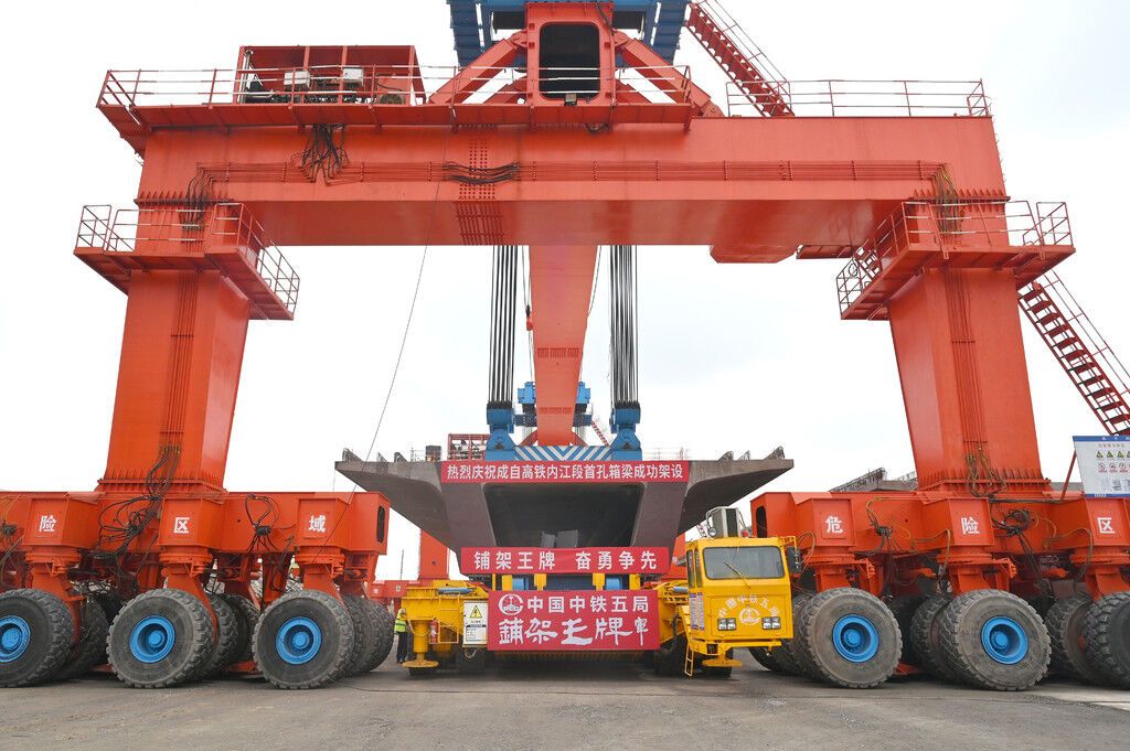 3月17日,随着中国中铁五局施工人员操作着JQ900A架桥机将第一孔预制箱梁架设在威远县高石镇伞岭村民新乡大桥桥墩上,成自高铁内江段首孔箱梁成功架设,四川省首条350公里的高速铁路建设再迈进一大步。