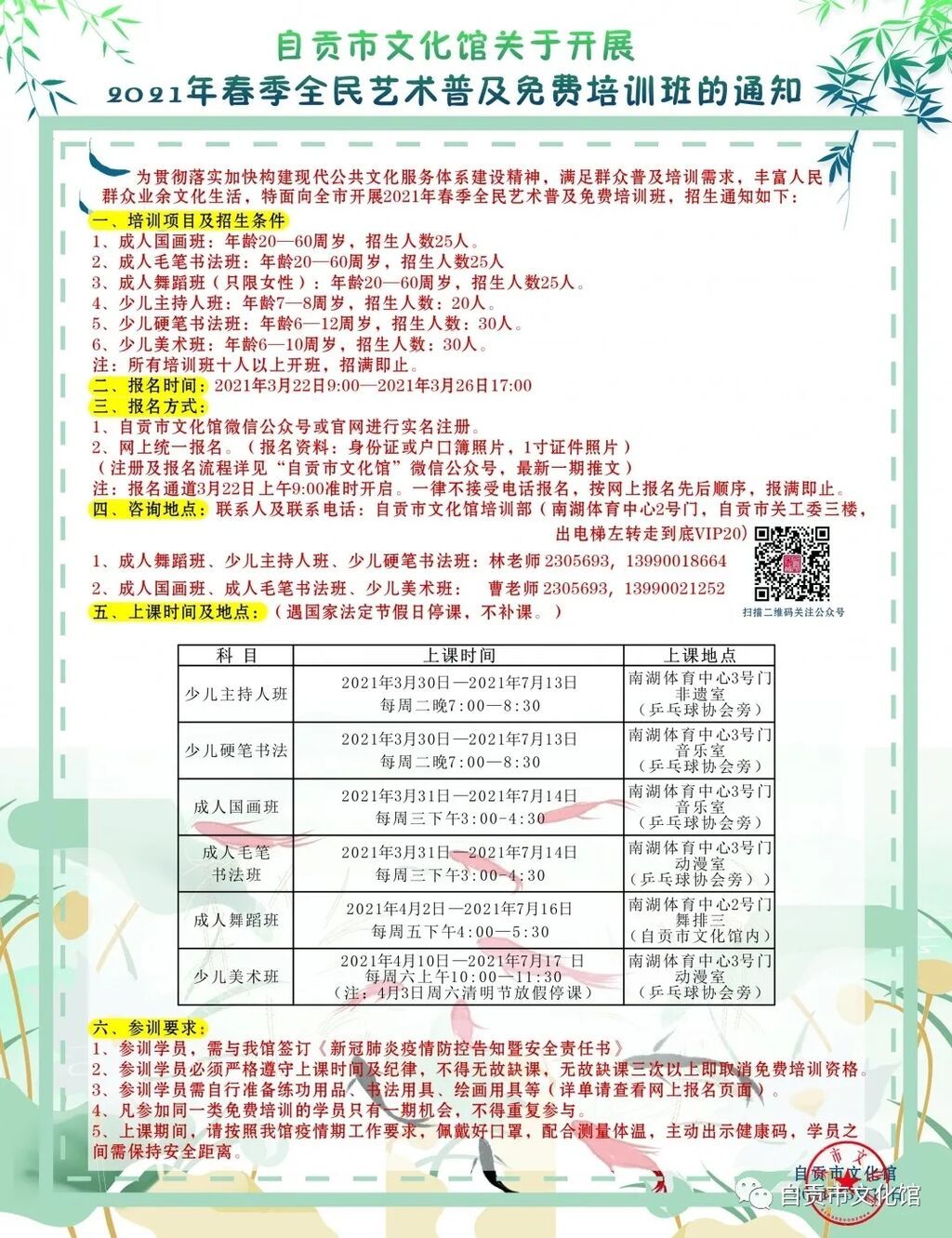 记者从市文化馆获悉,2021年春季全民艺术普及免费培训班即将于3月下旬开班。本次免费培训开设了成人国画班、成人毛笔书法班、成人舞蹈班、少儿主持人班、少儿硬笔书法班、少儿美术班六大课程。