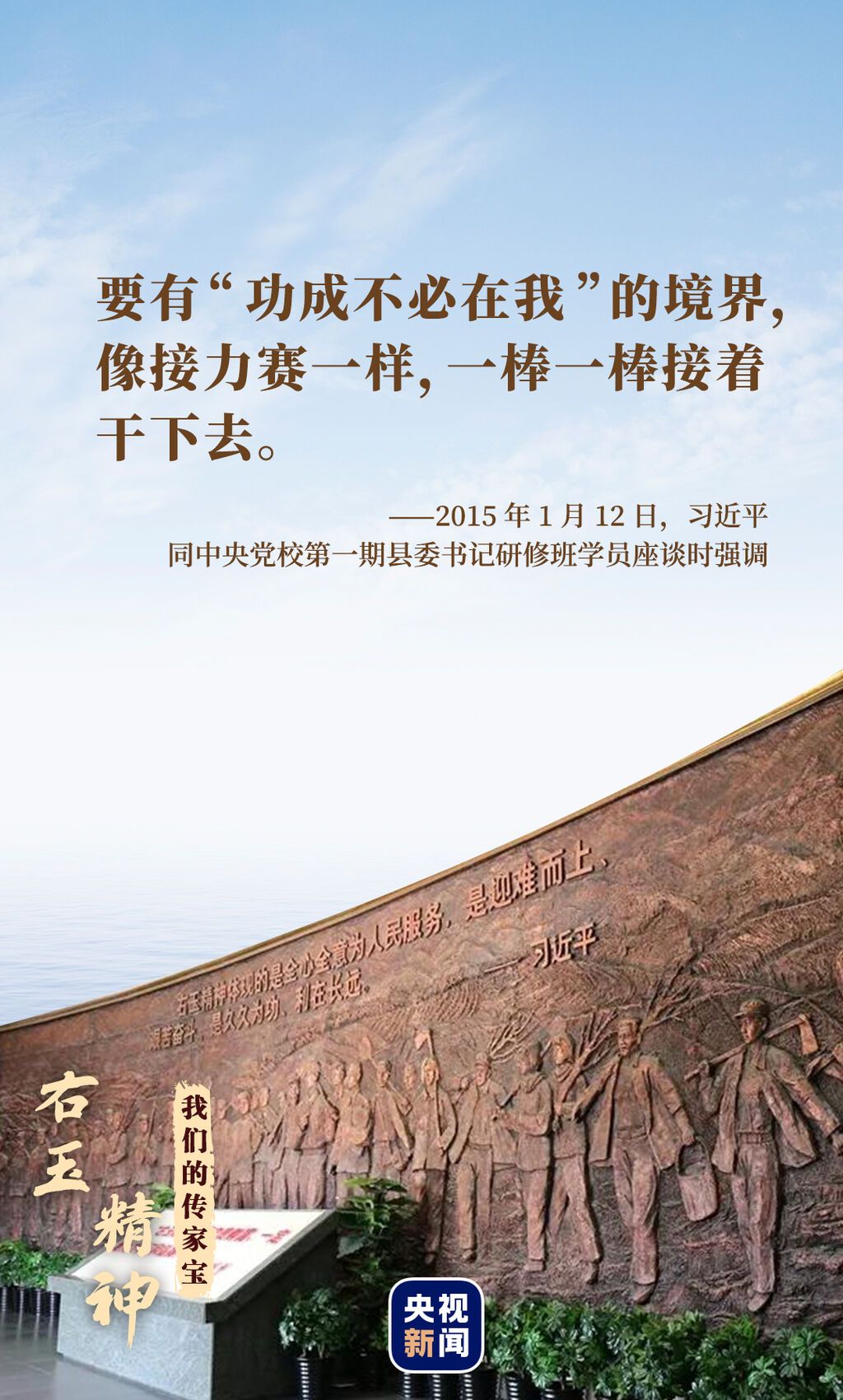 2015年1月,习近平总书记在同中央党校第一期县委书记研修班学员座谈时,讲到了右玉历届县委带领人民群众治沙造林的故事,并要求大家要有“功成不必在我”的境界,像接力赛一样,一棒一棒接着干下去。