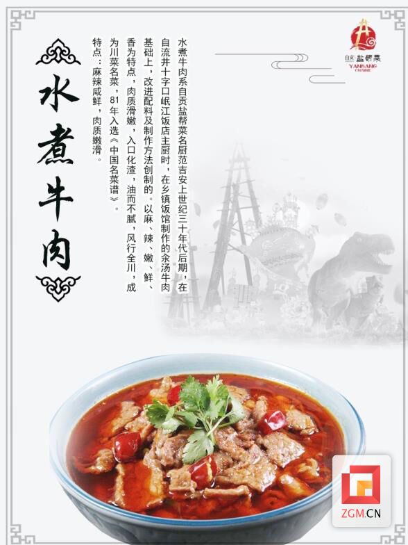 水煮牛肉系自贡盐帮菜名厨范吉安上世纪三十年代后期,在自流井十字口岷江饭店主厨时,在乡镇饭馆制作的汆汤牛肉基础上,改进配料及制作方法创制的。以麻、辣、香、嫩、鲜、烫、滑为特点,肉质滑嫩,入口化渣,麻辣鲜香,风行全川,是川菜四大名菜之一。