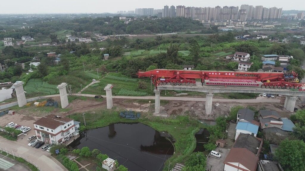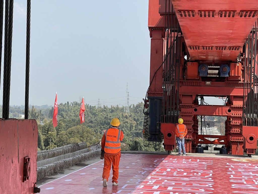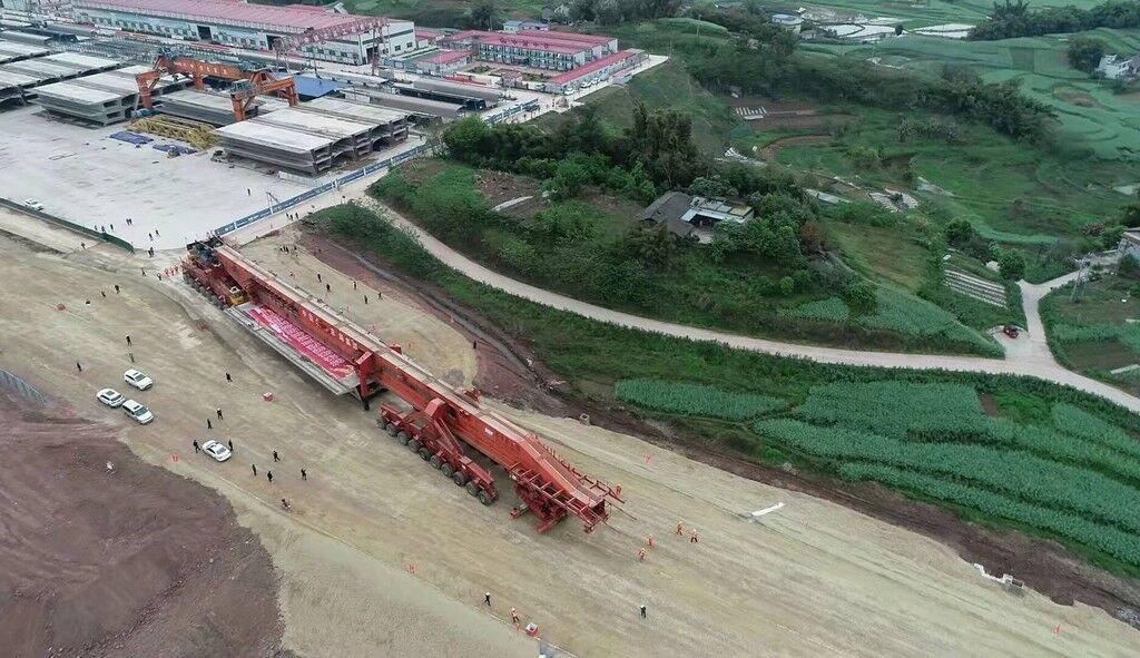 成宜高铁箱梁架设采用的是运架一体机设备,又称流动式架桥机。“该设备首次在四川高铁建设中使用。”中铁北京工程局集团自宜铁路工程指挥部柴敬尧告诉川观新闻记者,运架一体机可提吊箱梁运输,能够保证箱梁通过隧道时的最大间距、减少箱梁通过隧道的时间,能够满足桥隧相连、隧道内架梁等特殊工艺要求,符合川南地区高铁建设桥隧众多、丘陵地貌的建设状况需求。