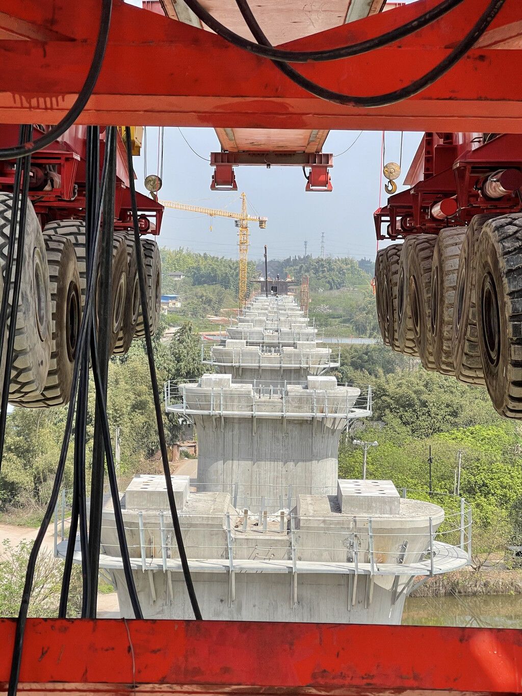 当架桥机来到架梁处,放置在车顶的箱梁被“提”着向前伸出,轻轻地放置在两个桥墩间,这时,主机的40个、直径1.75米的轮胎就成为了支撑,让架桥机稳稳地立在原地,直至架梁完成。