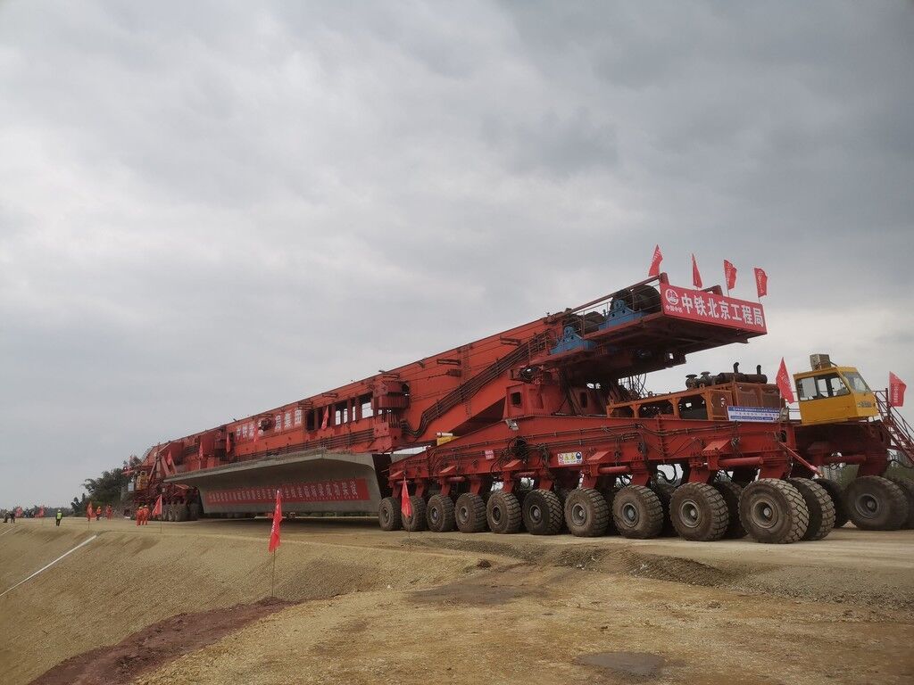 釜溪河双线特大桥全长1941米,需架设47榀箱梁,此次架设的首榀箱梁长32米,重900吨,由中铁北京工程局集团承建。
