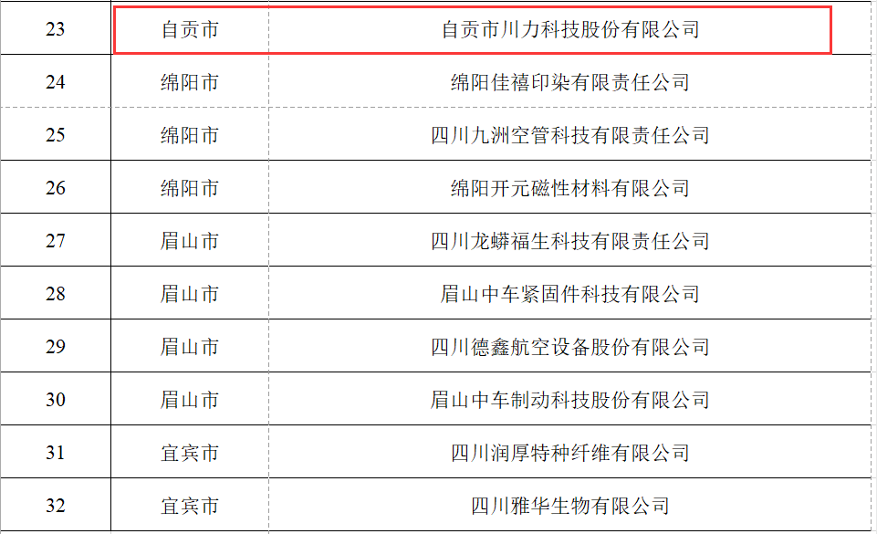 3月22日,四川省经济和信息化厅发布四川省第一批国家重点支持专精特新“小巨人”企业拟推荐名单,共有来自全川5个地区的32家企业入围拟推荐名单。其中自贡市川力科技股份有限公司上榜。
