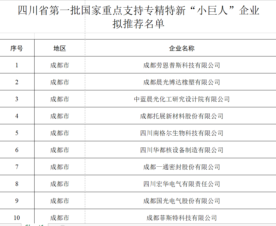 根据《财政部工业和信息化部关于支持“专精特新”中小企业高质量发展的通知》(财建〔2021〕2号)《四川省经济和信息化厅四川省财政厅关于开展“专精特新”中小企业高质量发展重点企业和服务平台(第一批)申报工作的通知》(川经信企业〔2021〕40号)相关要求,经企业自主申报、市(州)初审推荐、专家评审等程序,现将拟推荐第一批国家重点支持专精特新“小巨人”企业名单予以公示。