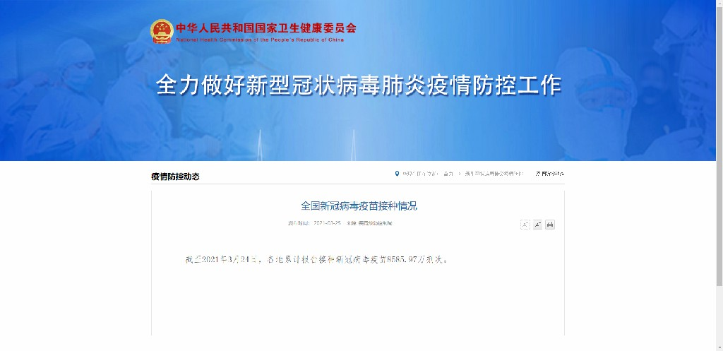 据国家卫健委消息,截至2021年3月24日,全国各地累计报告接种新冠病毒疫苗8585.97万剂次。
