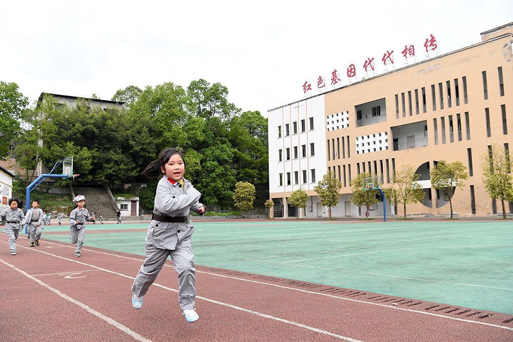3月27日,中国工农红军重庆綦江王良红军小学学生在操场上跑步。新华社记者 唐奕 摄