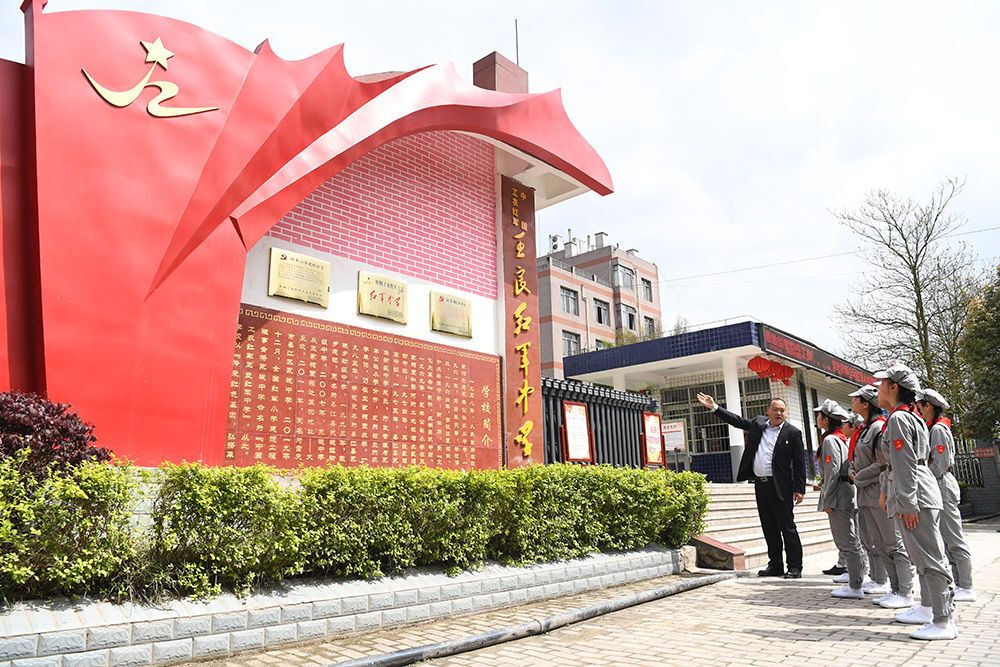 3月27日,中国工农红军王良红军中学校长袁海龙(左一)在学校门口向学生们讲述王良同志的故事。新华社记者 唐奕 摄