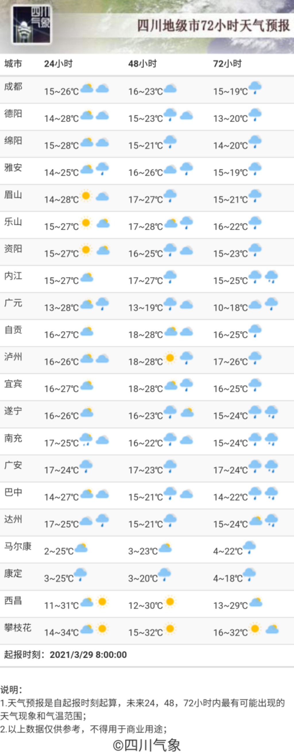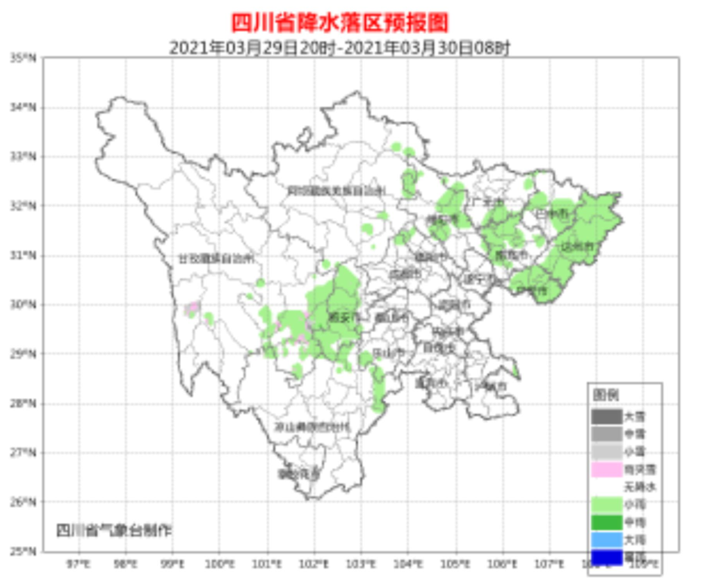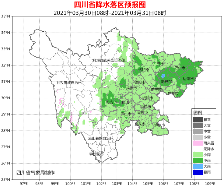 3月30日白天到晚上,四川盆地各市阴天有小雨,其中广元、绵阳、雅安、巴中、达州、广安、南充7市部分地方有中雨,个别大雨;阿坝州东部、甘孜州南部以及凉山州东北部阴天间多云有局地阵雨,川西高原和攀西地区其余地方多云。