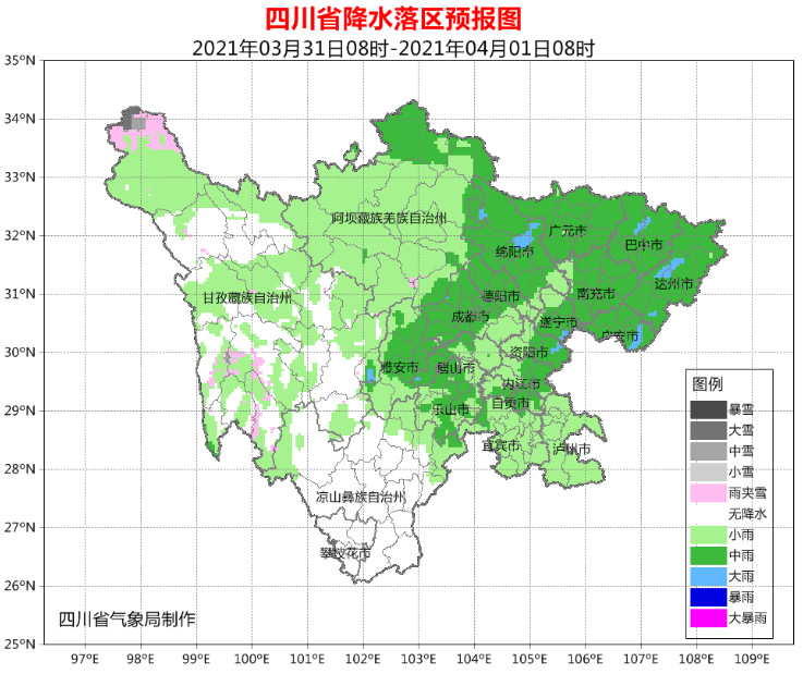 3月31日白天到晚上,四川盆地各市阴天有小到中雨,局部大雨;阿坝州阴天有阵雨,其中北部、东部局地有中雨,甘孜州多云间阴天有分散阵雨(雪),攀西地区以多云天气为主。