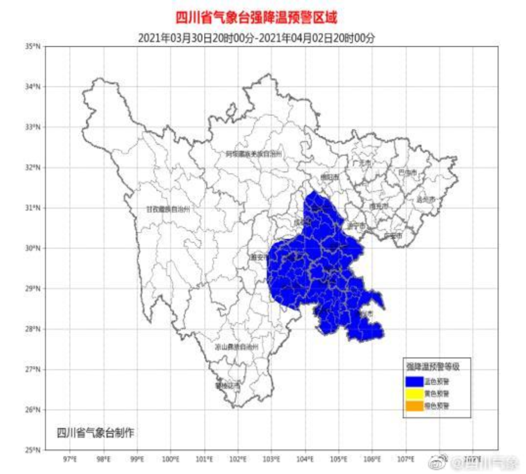 四川省气象台3月30日16时发布强降温蓝色预警: