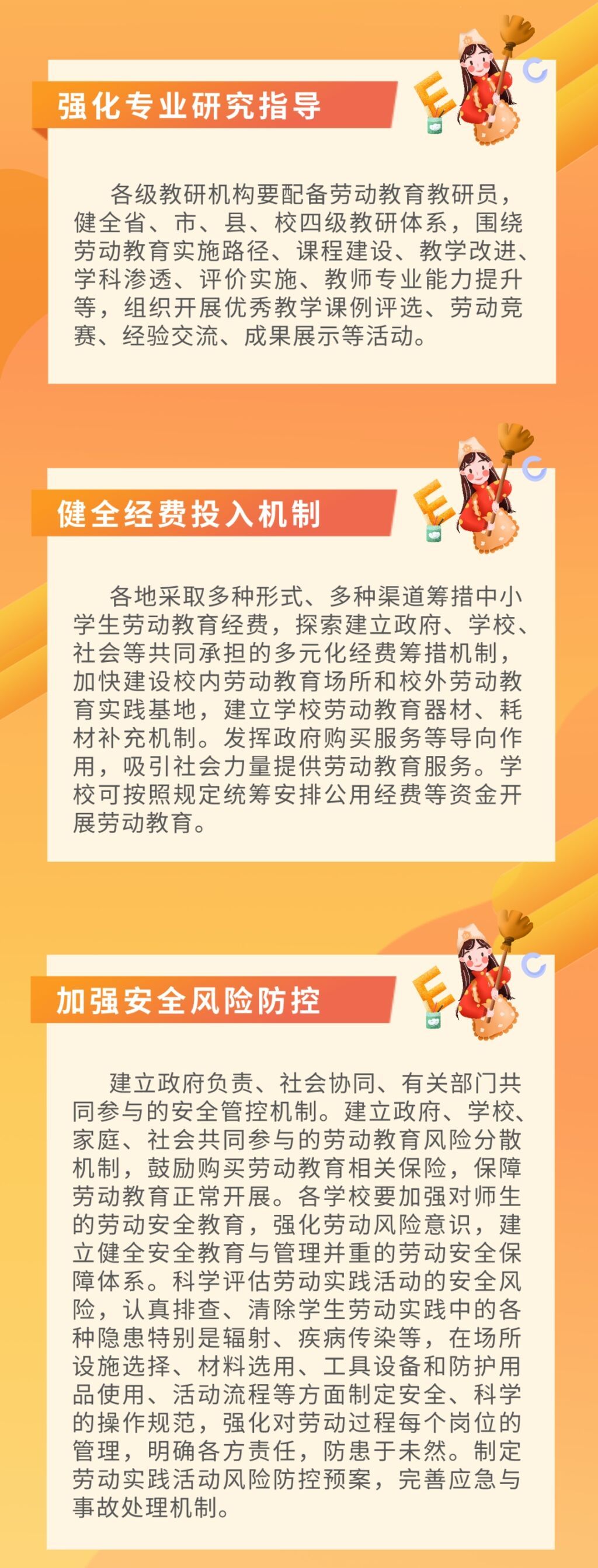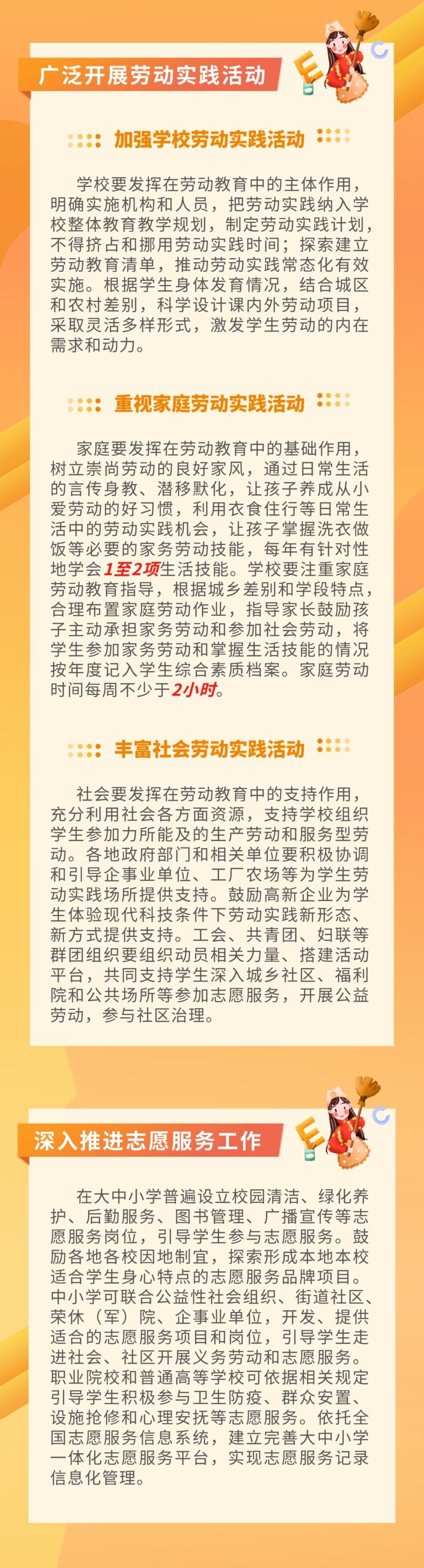 近日,四川省教育厅等10部门联合印发《全面加强新时代大中小学劳动教育实施方案》,要求全省大中小学开设劳动教育必修课程,保障中小学劳动教育课每周不少于1课时,职业院校专题教育不少于16学时,普通高等学校本科阶段不少于32学时。