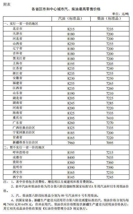 附:各省区市和中心城市汽、柴油最高零售价格