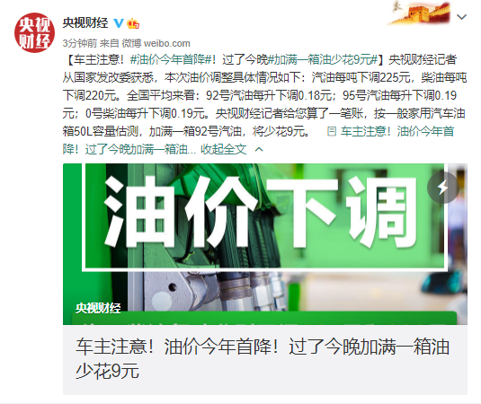 全国平均来看:92号汽油每升下调0.18元;95号汽油每升下调0.19元;0号柴油每升下调0.19元。记者给您算了一笔账,按一般家用汽车油箱50L容量估测,加满一箱92号汽油,将少花9元。