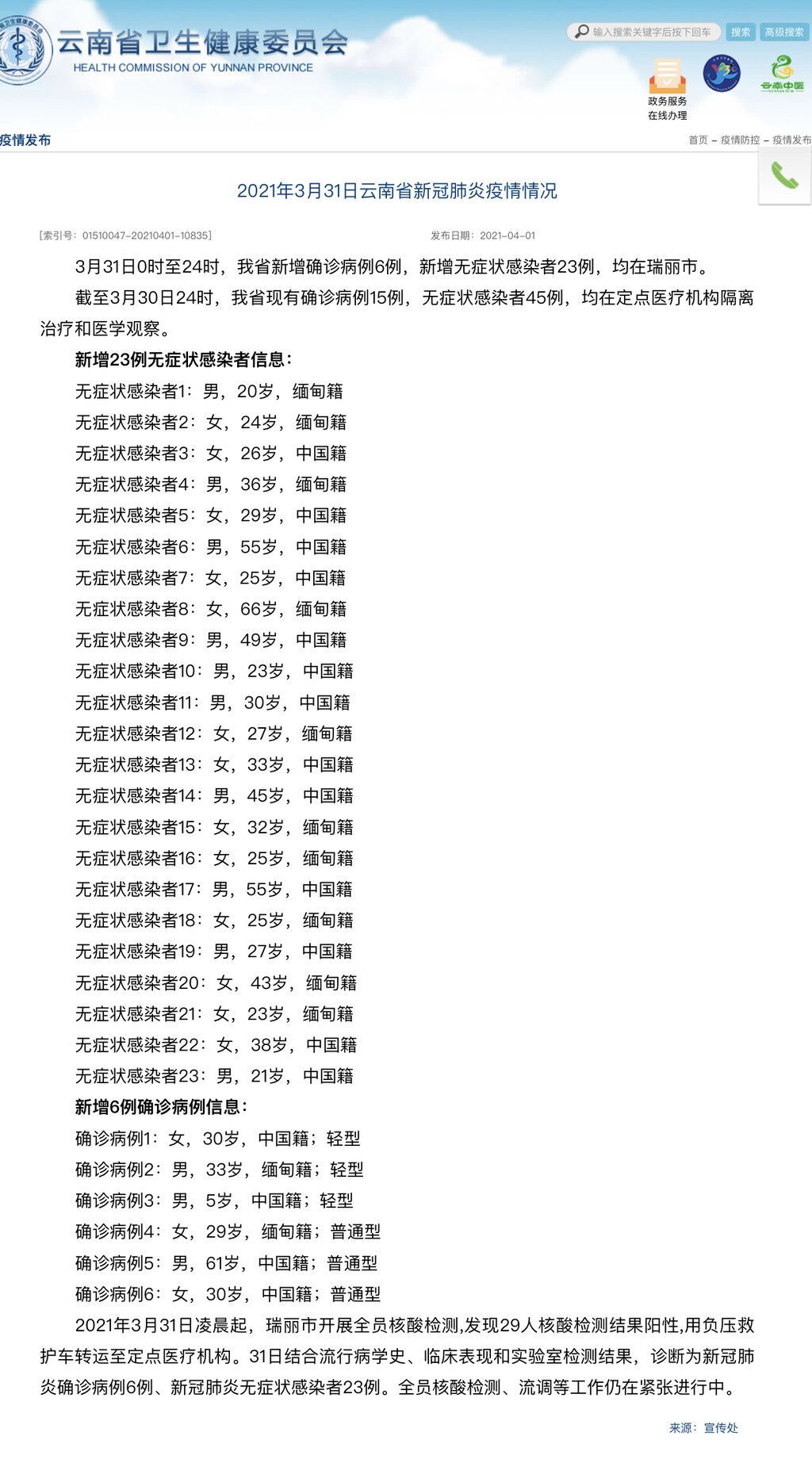 云南卫健委消息,3月31日0时至24时,云南省新增新冠肺炎确诊病例6例,新增无症状感染者23例,均在瑞丽市。