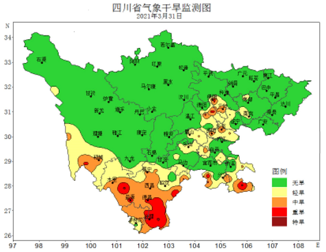 根据气象部门监测,3月四川全省平均气温偏高2.1℃,排历史同期第5高位。截至3月31日,全省有53站(盆地30站)出现干旱,其中重旱13站(盆地6站)、特旱10站(盆地5站)。中度以上旱情主要分布在盆中、盆南、攀西大部和甘孜州南部。
