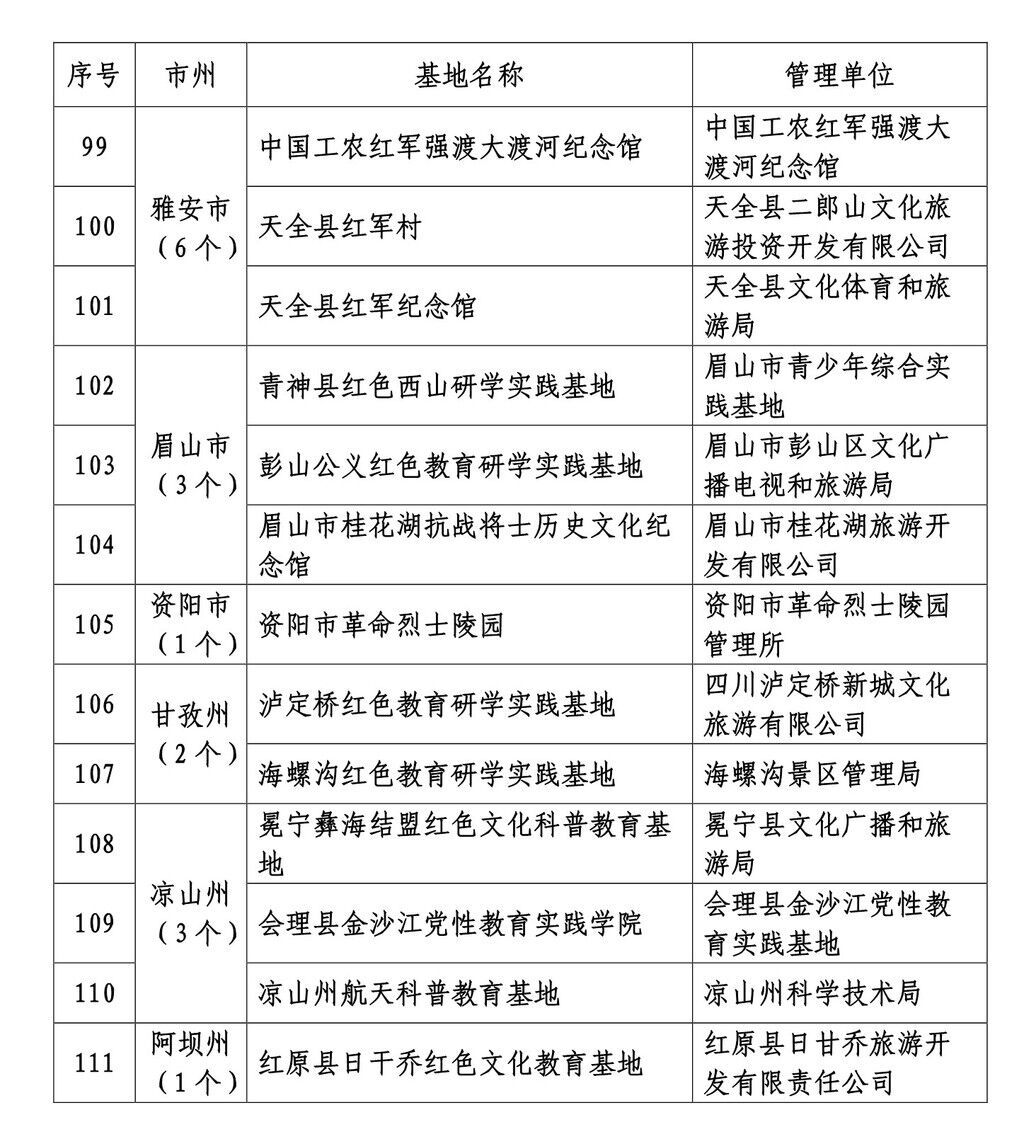 根据评审组意见,拟认定雅安市中国工农红军强渡大渡河纪念馆、甘孜州泸定桥红色教育研学实践基地等111家单位为四川省中小学红色教育研学实践基地,现予公示,公示时间为4月8日至4月14日。